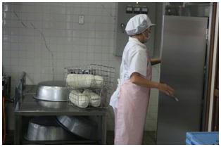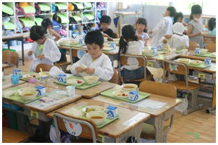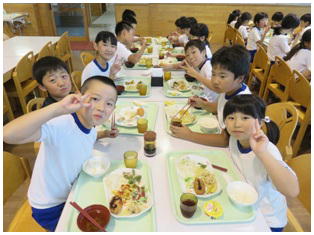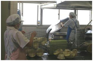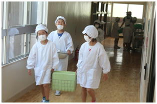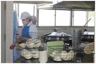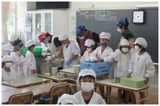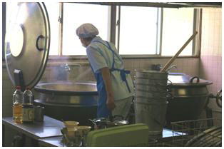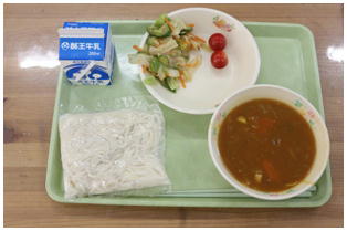 今日の給食の献立は、「ソフト麺」「カレーうどん汁」「牛乳」「いかとキュウリのごまずあえ」「ミニトマト」でした。調理室では、とても暑い中、調理員の方々が児童のために美味しい給食づくりに励んでくれていました。