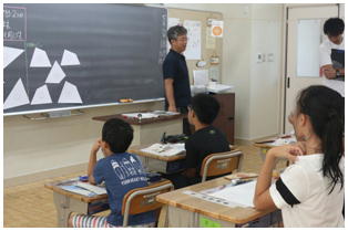 5年生の算数の授業の様子です。図形の合同についての授業です。いつも5・6年の算数は2人の先生で授業を行っていますが、特に今回の単元は、教頭先生がメインで進めます。