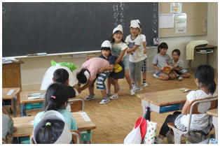 1年生が、国語で学習した「おおきなかぶ」を劇にして発表会を行いました。3つのグループに分かれて、みんな一生懸命に役を演じることができました。また、教科書を読む係の児童もたいへん上手に読んでいました。