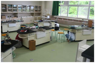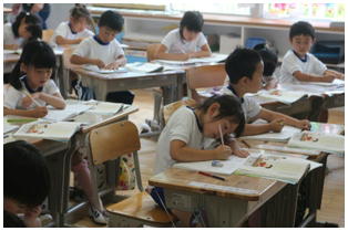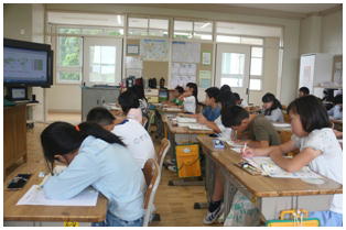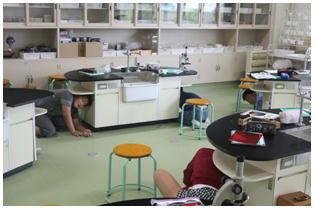 3校時目、理科室で授業をしているところを訪問したところ、突然地鳴りとともに突き上げるような地震がありました。さすがに6年生、とっさに机の下にもぐり、身の安全を確保しました。