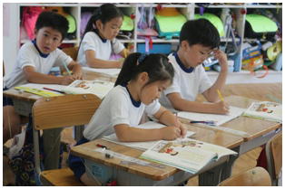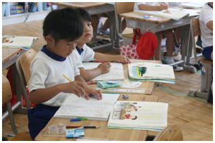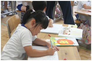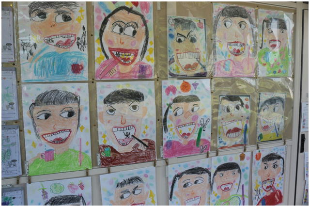 国語の授業に一生懸命取り組んでいる1年生です。廊下を見ると、楽しい絵がたくさん提示してりました。