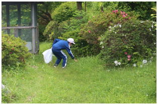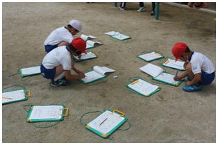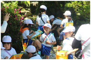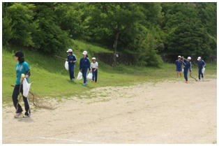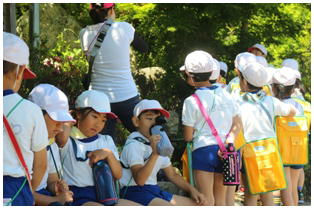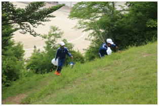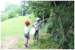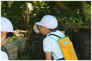 事前にスズメバチの巣がないかなど安全を確認した上で、6年生が、図工の授業で使う枯れ枝などの材料を取りに希望ヶ丘に入りました。途中、スズメバチの罠を見つけて「入っているかな~」と興味津々でした。ちなみに1週間ほど放置していた3つの罠の中には、カブトムシ1匹を含め30匹ほどのスズメバチが入っていました。
