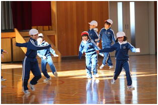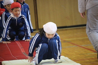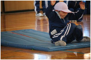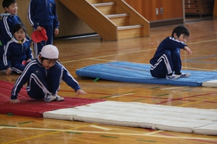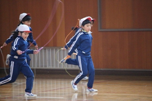 2年生の体育の授業の様子です。跳び縄を使っての運動、マットでの前転の練習と一生懸命取り組みました。