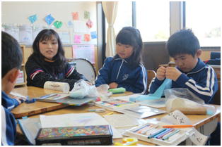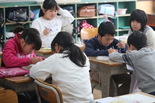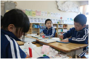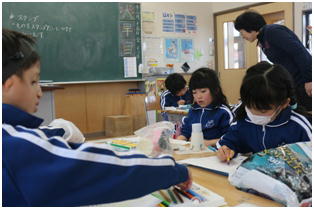1年生は、凹凸のあるものに紙を載せて、クレヨンで上から模様を写し出す授業を行っていました。いろいろな発見があったようです。