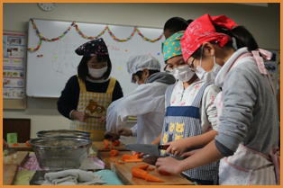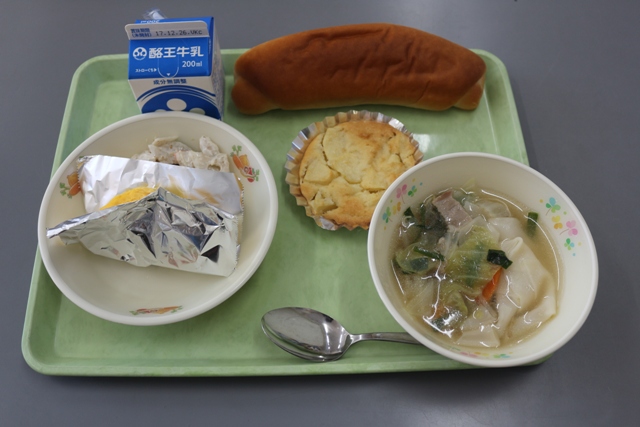 もうすぐ冬休みです。2学期の給食も今日を含めてあと4回です。今日の献立は、コッペパン、レンコンのサラダ、オムレツ、ワンタンスープ、牛乳でした。それに調理員さんが作ってくれた「りんごのカップケーキ」がつきました。とても美味しくいただきました。