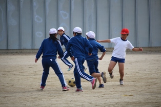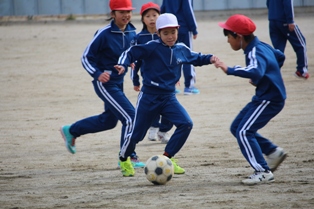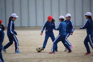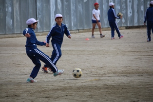 5年生の今日の4校時目の授業は体育です。男女混じってのサッカーの授業の様子です。男女関係なく負けじとボールを奪いにいっています。
