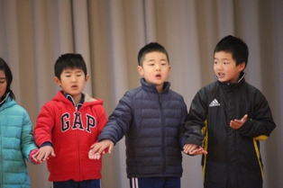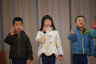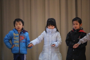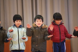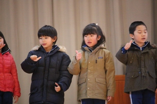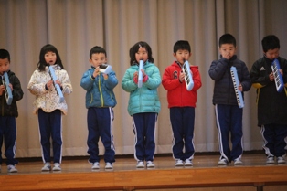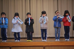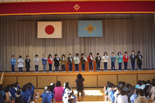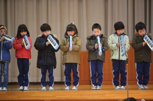 今日の発表集会は、朝のきびしい寒さのため2校時終了後の業間に行いました。今日は、1年生の発表で、ピアニカを使った発表や歌の発表を元気いっぱいに行いました。