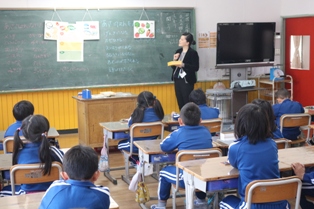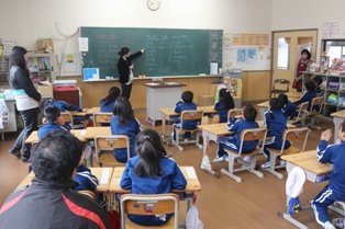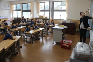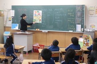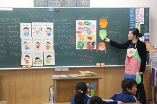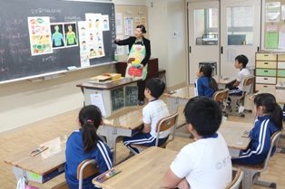 今日から3日間、町の栄養士さんにきていただいて食育教室が行われています。今日は、1・2年生で行われ、好き嫌いを無くしてバランスのよい食事を心がけることが大切だということを学びました。