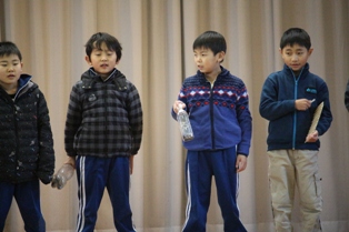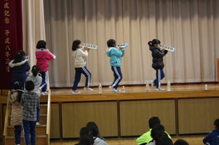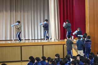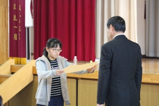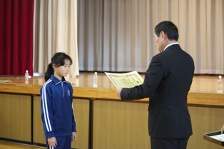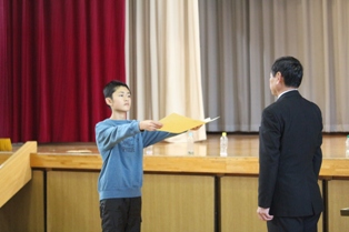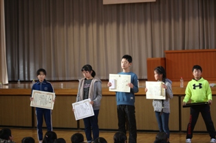 発表集会の前に①「県児童作文コンクール」、②「地区児童書写コンクール」、③「火災予防絵画ポスターコンクール」、④「立看板コンクール」の表彰を行いました。①、②については代表で賞状の伝達を行いました。