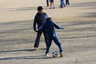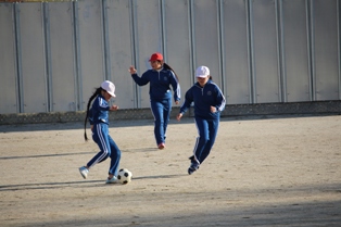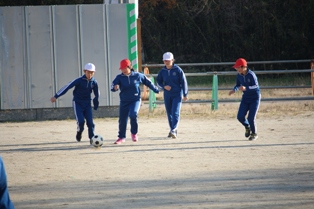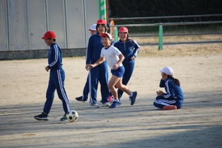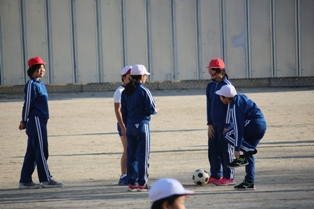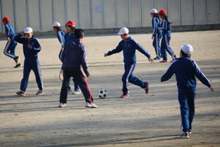 5校時目の6年生の体育の授業の様子です。先生も混じってのゲーム形式のサッカーの授業の様子です。みんな夢中になって楽しんでいます。