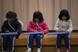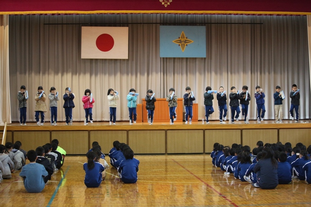 今朝の発表集会は、2年生による鍵盤ハーモニカの演奏と歌の発表でした。