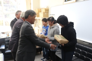 地元、石川町認定農業者会の方々においでいただき、地産地消と食育の推進を図るため、地域の慣行栽培で使用される農薬、化学肥料の双方を50%減らして栽培された王子平産の「特別栽培米」をいただきました。このお米は、12月8日(金)の給食で提供されます。ありがとうございます。全校生で美味しくいただきます。