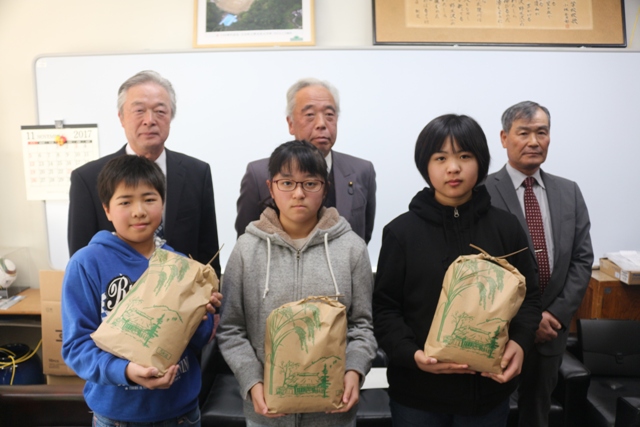 2017年12月1日 12時56分 地元、石川町認定農業者会の方々においでいただき、地産地消と食育の推進を図るため、地域の慣行栽培で使用される農薬、化学肥料の双方を50%減らして栽培された王子平産の「特別栽培米」をいただきました。このお米は、12月8日(金)の給食で提供されます。ありがとうございます。全校生で美味しくいただきます。