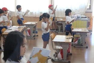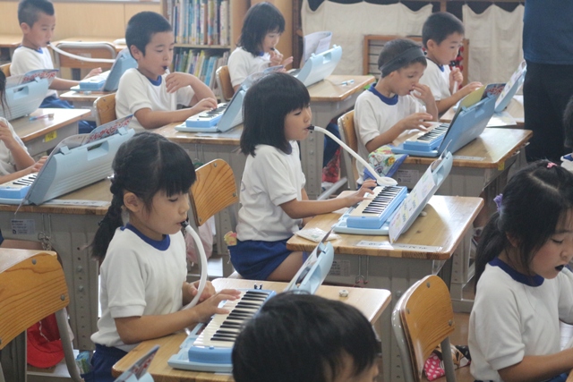 1年生はみんなで鍵盤ハーモニカの練習です。