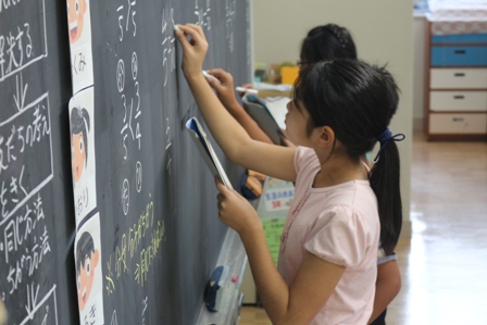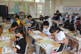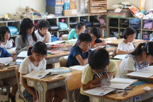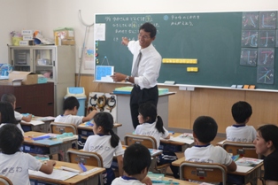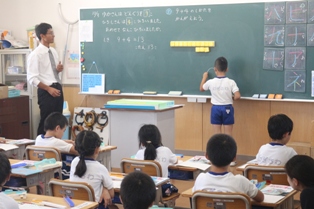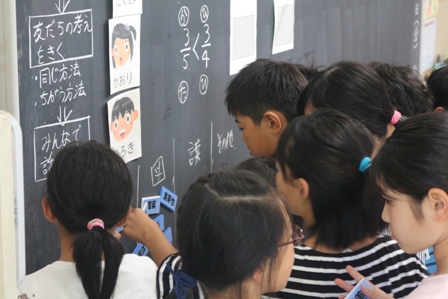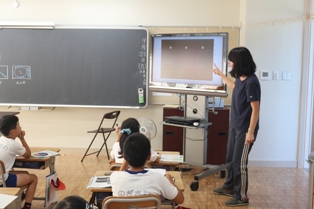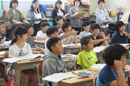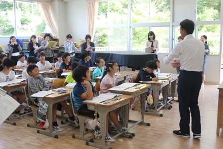 本日は、時々石川中学校から来てくださる先生による授業研究会が5年生で行われました。まわりにたくさんの先生方がいるからか緊張気味の児童もいました。