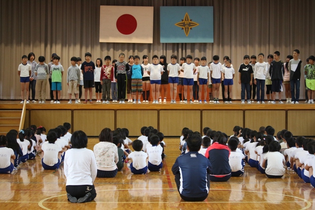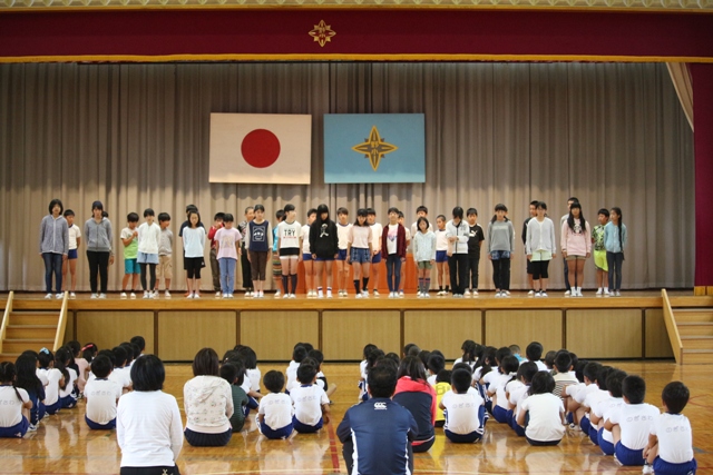 今日の朝の会は、10月6日(金)に実施される地区小体連の壮行会でした。大会に出場する5・6年生がそれぞれ紹介され、4年生からの激励の言葉、6年生のお礼の言葉がありました。