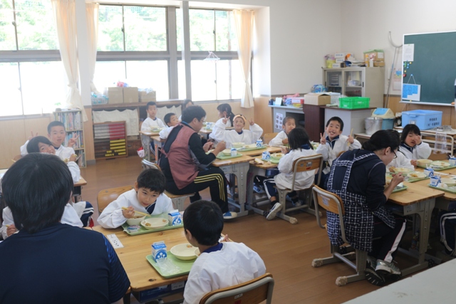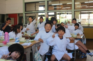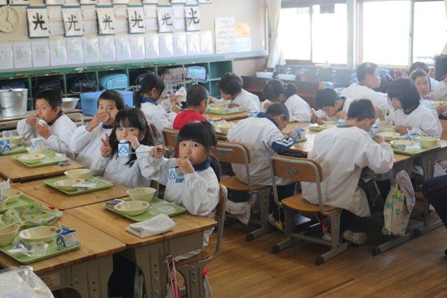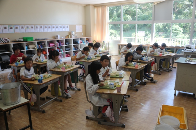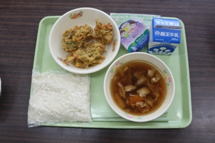2017年10月4日 14時21分 今日の給食の献立は、「ソフトめん、うどん汁、お月見デザート、かき揚げ、牛乳」でした。みんな美味しそうに食べています。