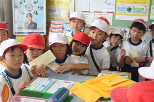 2年生は、生活科で野木沢郵便局を訪問しました。職員の方々への質問や、実際に代表の子が封筒に貼る切手を買い、ひとりひとりが自分の封筒に切手を貼って、職員の方々に郵送をお願いしていました。