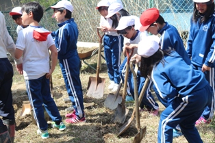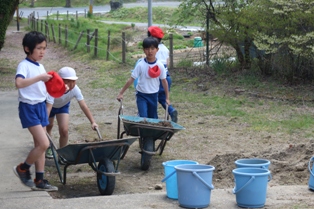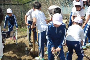 昨年までは、バケツで稲を育てていましたが、今年は5年生で実際田んぼ作りから始めようということで、JAの方の御協力を得ながら4㎡ほどの田んぼ作りを始めました。今後が楽しみです。