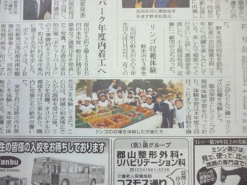 12月2日(金)、福島民友新聞に、3年生が相樂りんご園さんでりんごの収穫をしたときの様子が記事として掲載されました。