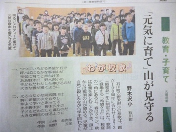 2016年12月6日 16時16分12月6日(火)、本日の福島民友新聞に、野木沢小学校の校歌を紹介する記事が掲載されました。これは11月21日に取材を受けた内容です。ぜひ、ご覧ください。