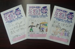 2016年8月3日 10時39分今年度の防犯交通安全看板コンクール出展作品ができあがりました。協力して作り上げた作品は、イラストはもちろんすばらしいうえに、呼びかけが、なんとも味のある、野木沢の言葉(ふるさとの言葉)を使ったものとなりました。ぜひご家庭でも独特のイントネーションで発音してみてください。「でんなよ~」「し(ひ)かれっつぉ~」。そしてさらに交通安全への意識が高まればと思います。(ふるさとの言葉も大事にしたいと思います。)