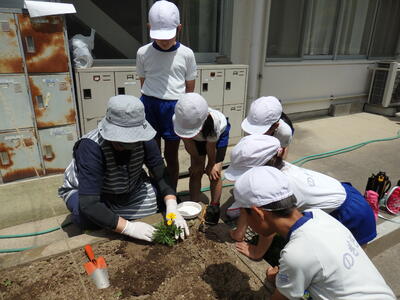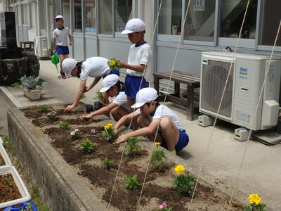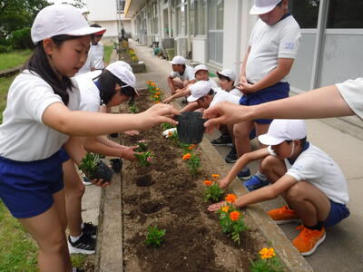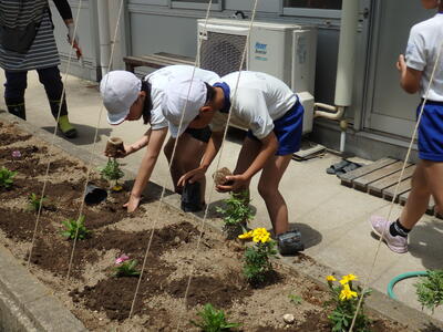 先週末、各学年で花壇手入れを行いました。チューリップの球根を掘り起こした後の花壇に、新しい花を植え付けました。夏に向けて、新しい花々が花壇を彩ります。