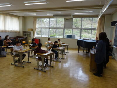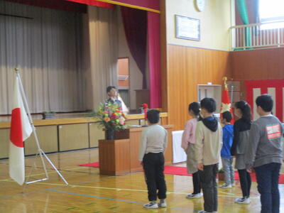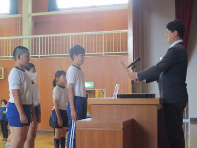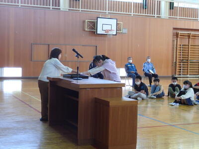 全校児童37名で、最後の1年のスタートです。新しい教科書を代表児童が受け取り、校長先生からは「自ら学ぶ子ども」「心の豊かな心」「たくましい子ども」「進んで働く子ども」を目指して、「気づき、考え、実行するを実践していきましょう。」とお話がありました。