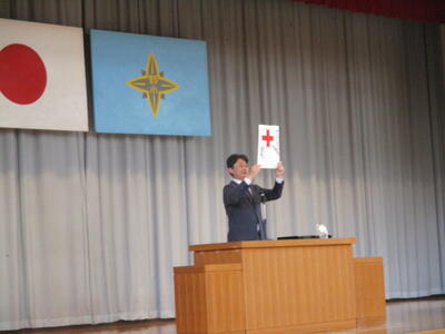 代表児童に登録証が手渡され、「青少年赤十字の一員として、心身を強健にし、人のためと郷土社会のためにつくすことを誓います」と誓いの言葉が述べられました。