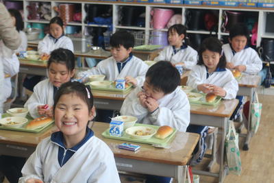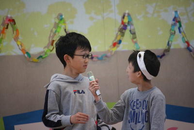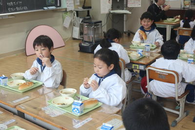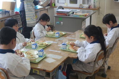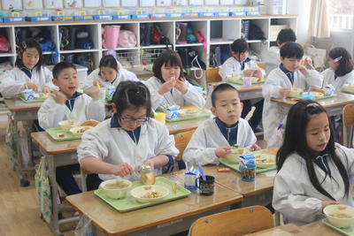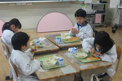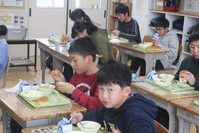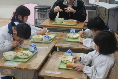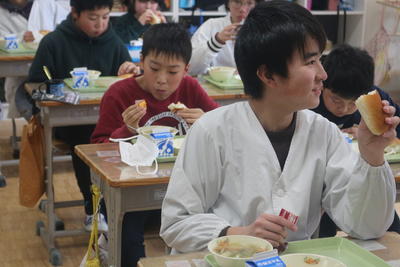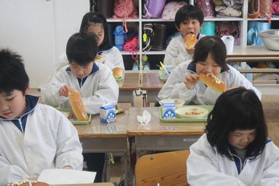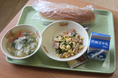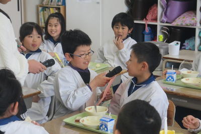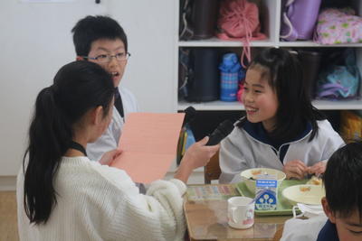 本日の給食の献立は「コッペパン」「みぞれスープ」「ウィンナーと卵の炒め物」「メープルシロップ風&マーガリン」「牛乳」でした。みんなおいしそうに食べていましたが、突如2年生の教室に放送委員会の「突撃インタビュー」が乱入してきました。大喜びの2年生2名へのインタビューが行われました。