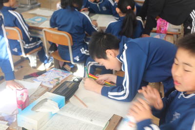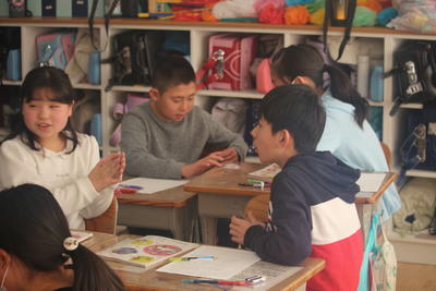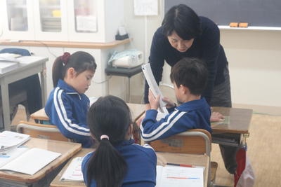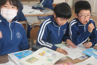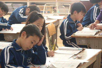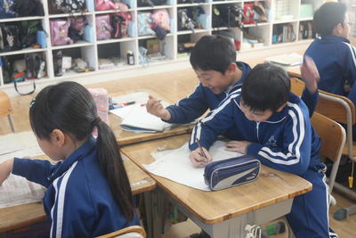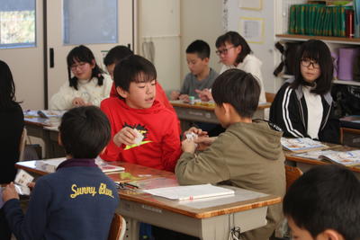 4年生の国語の授業では,調べたことを新聞にまとめる作業を行っていました。班のみんなで話し合いながら知恵を出しながら一生懸命学習していました。