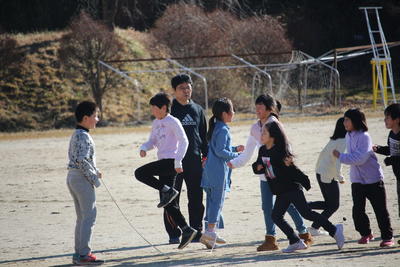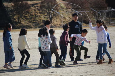 縄跳び記録会に向けて,3年生が校庭で長縄跳びの練習に励んでいました。天気もよく一生懸命練習していました。