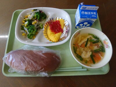 今日の給食は、ふくしま健康応援メニューを取り入れました。副菜(汁)の「ニラとひき肉のたまごスープ」は、中テレクックラボ(福島中央テレビ)のレシピです。食べる薬草“ニラ”の硫化アリルは肉や卵に含まれるビタミンB1の吸収率を上げてくれるそうです。野菜がたくさん摂れるバランスのよい献立でした。