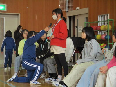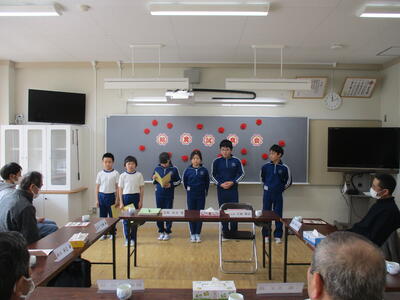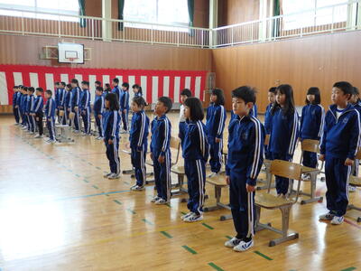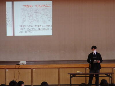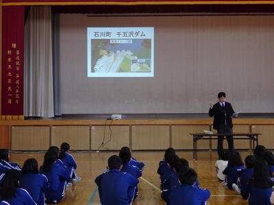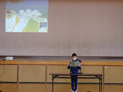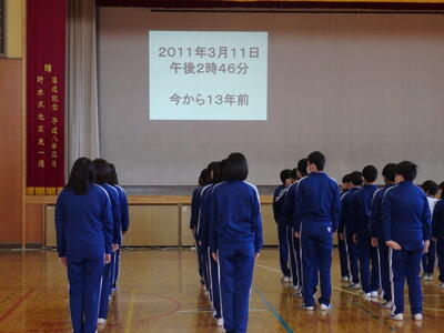 3月11日、東日本大震災追悼の全校集会を行いました。校長先生から、東日本大震災の様子や「つなみてんでんこ」の話があり、普段から防災について学んだり避難訓練などをしっかり行う必要があるとの意識を高めました。その後、4年生の児童が、総合的な学習の時間で学んだ、治水のための洪水調節機能をもつ千五沢ダムについて発表しました。