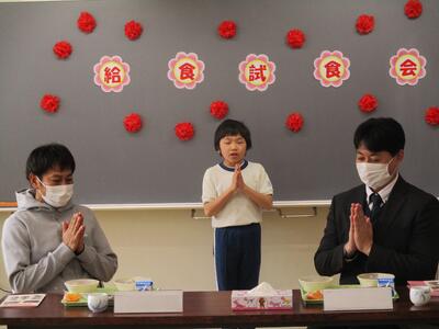 今日は、給食の食材を提供して下さっている生産者の方と学校評議員の皆さんをお招きし試食会を行いました。子ども達から生産者の方に日頃の感謝の言葉が伝えられました。「ゆかりごはん」や「レバーのみそだれがけ」などが好評で、バランスもよくおいしい給食だとの言葉をいただきました。