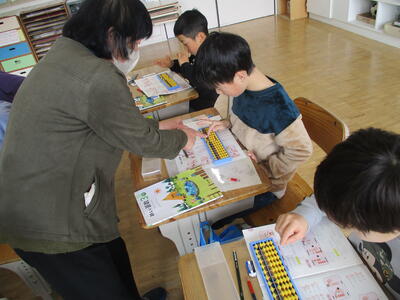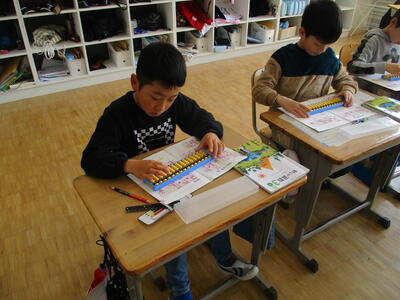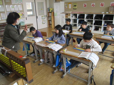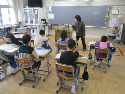 算数科の授業で、そろばんの先生をお招きして、そろばんの使い方について学習しました。それぞれの珠の意味や計算の仕方などを学び、足し算や引き算に挑戦しました。