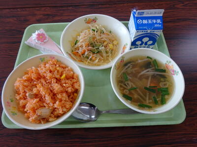 今年度最後の給食です。メニューは、チキンライス、牛乳、春雨サラダ、ウェーブワンタンスープです。デザートに桜のケーキをつけました。