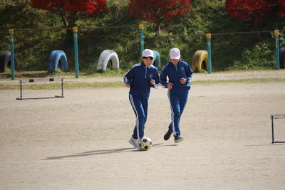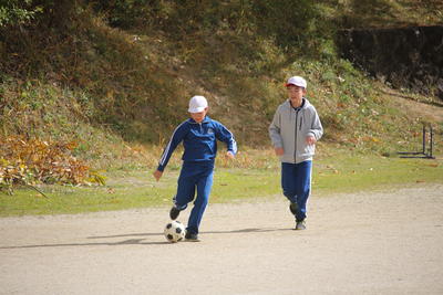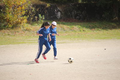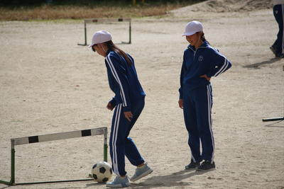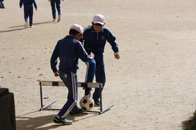 6年背の体育の授業は,2人が攻守に分かれてサッカーの基礎的ゲームをしています。