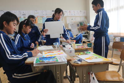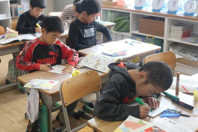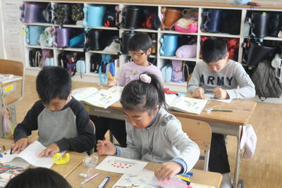 3年生の図工の授業は,最初に描いた絵があっという間に別の絵に変わる「ひみつのへんしんショー」の作品作りです。「どうやってかわるのか」「どのようにかわるのか」は,お子さんにお聞きください。