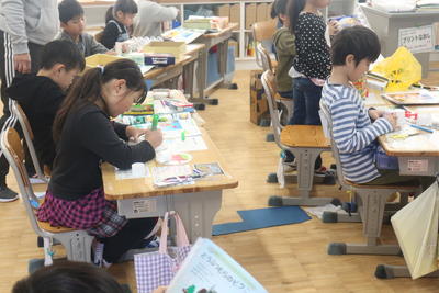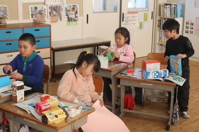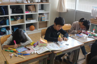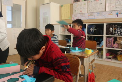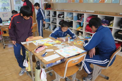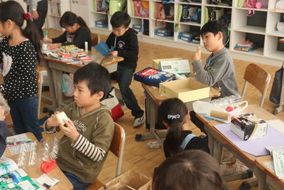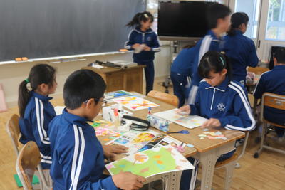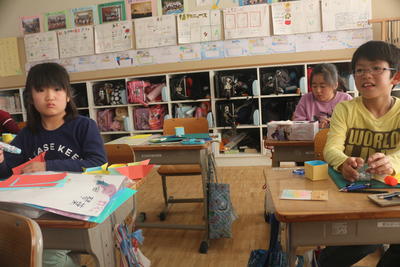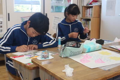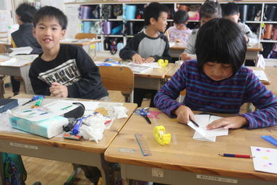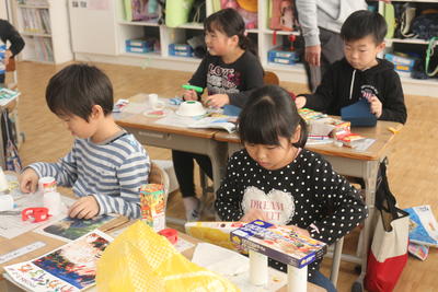 今日は,図工の授業がたくさんある日でした。1年生は箱を使って動物を作っていました。色紙を貼ったり、はさみで切ったりしながら工夫して作っていました。