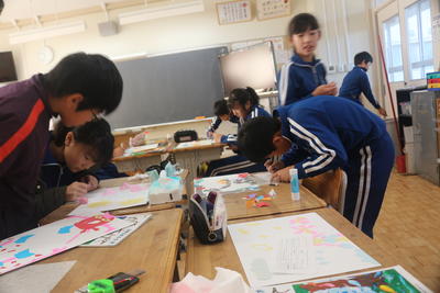 またまた図工の授業です。6年生の図工は,思いのままに紙を切って,それを思いのままに並べたり,重ねたりして貼っていき作品を仕上げる活動です。なかなか思うように行かない児童もいるようです。
