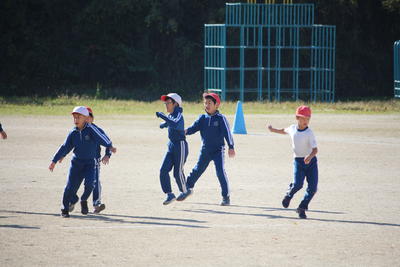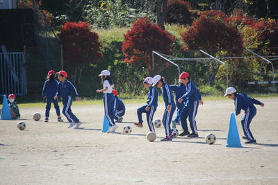 冷たい風が吹いていますが,3年生の児童は,校庭で体育の授業を行っています。準備運動から始まってボールを使った運動を行っています。