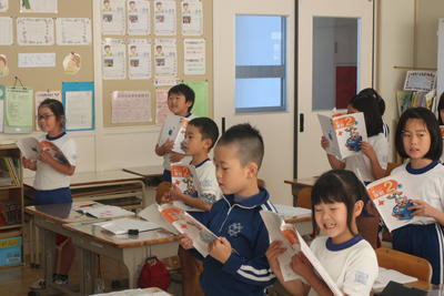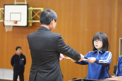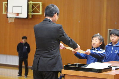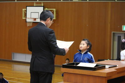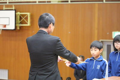今日の全校集会では,読書感想文福島県コンクールに入選した児童と地区図画コンクールで特選となり県作品展への出品となった児童への表彰,JA共済福島県小中学生交通安全ポスターコンクールで審査員特別賞となった児童への表彰を行いました。表彰の後「寒くなってきたので気温にあわせた服装をして風邪予防につとめましょう。」と話しました。風邪のような症状の児童が目立ってきています。ご家庭でもご指導をお願いします。