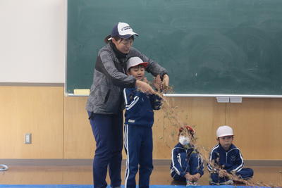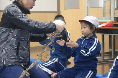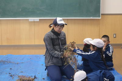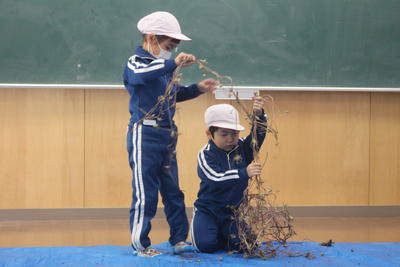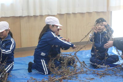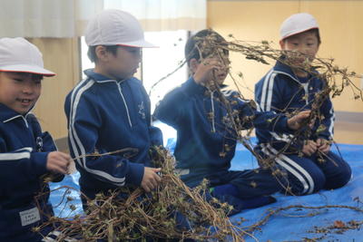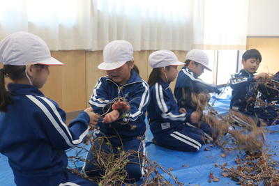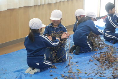 1年生は,ほとんど種ができあがっている朝顔のツルを使ってリース作りを始めました。リースを作る際に種がたくさんブルーシートに落ちています。この後みんなで拾います。クリスマスに向けてリースも立派に完成させます。