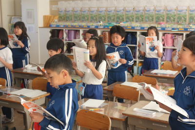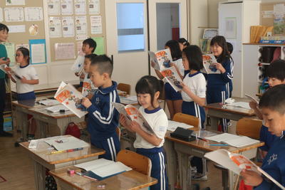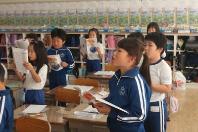 2年生の算数の授業は,7の段のかけ算でした。みんなで声をそろえて確認していました。
