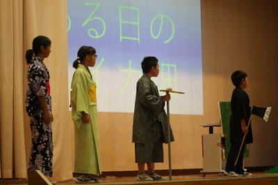 5年生は,総合学習で取り組んだ「バケツ稲の育成」をもとに学習の様子や「かかし」の話を取り入れた劇を演じました。