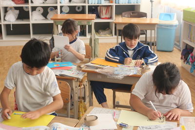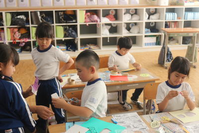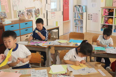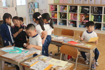 1年生の図工の授業です。「おさんぽコトコト」という動くおもちゃを作っていました。