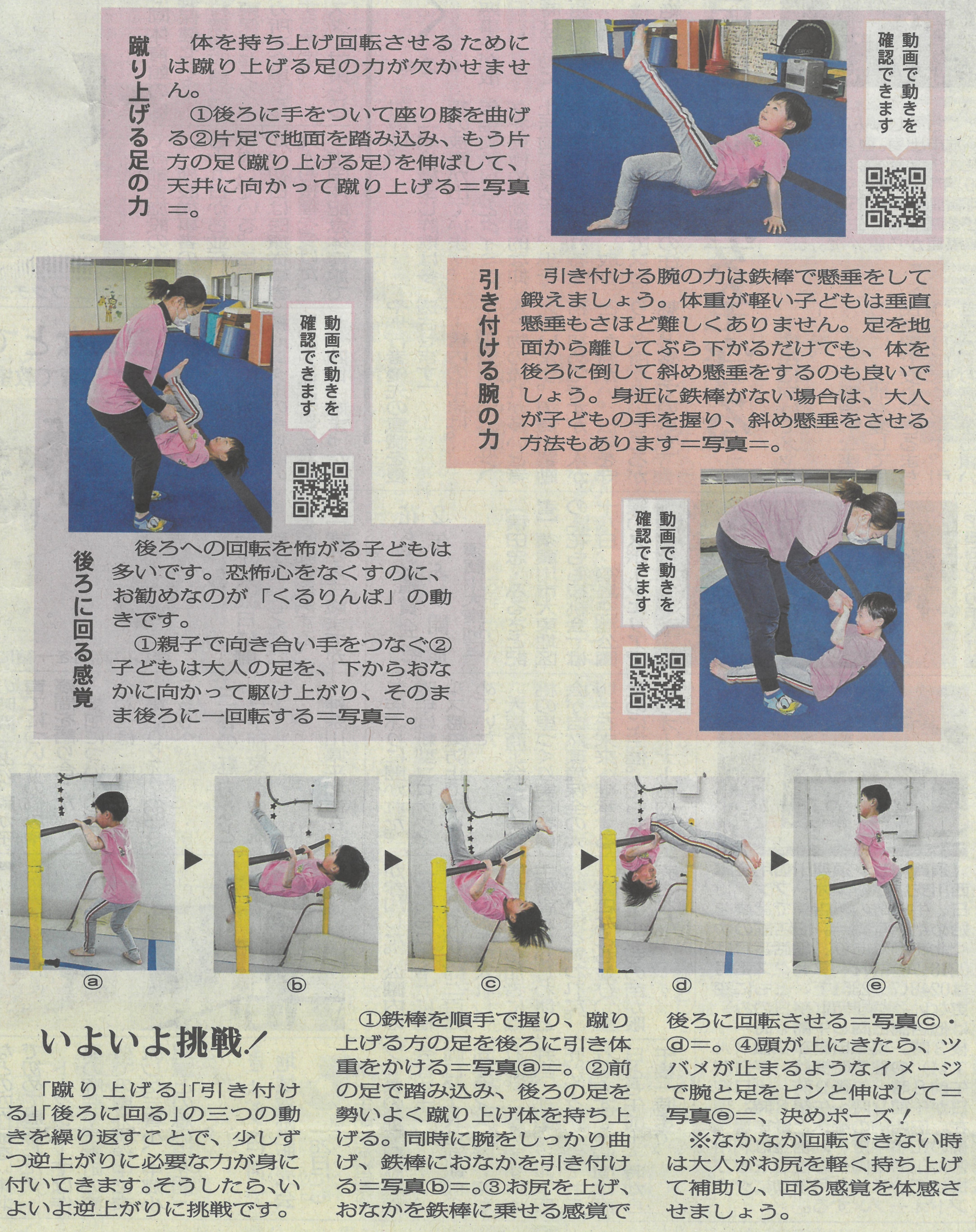 4/21の福島民報に、「逆上がりの成功のこつ」という記事が載っていました。「逆上がり」は、子どもにとっては、是非、できるようになりたい技の一つです。この記事の中では、逆上がりができるようになるためには、次の三つのポイントを挙げています。