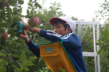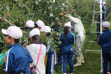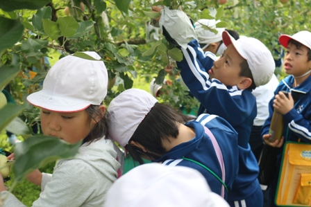 3年生が、いつもお世話になっている果樹農家さんにお邪魔してりんごの表面にシールを張って収穫時の模様付けの作業をさせていただきました。誤って、りんごをもぎってしまった子もいましたが、みんなたのしく一生懸命取り組みました。お世話になりました。